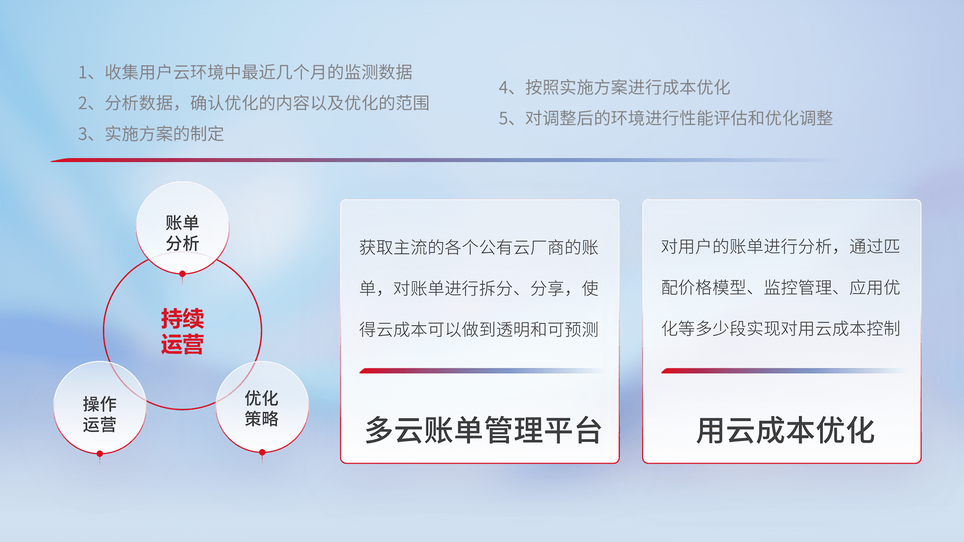 通过多云纳管,,以统一的资源数据模型把客户的云资源进行抽象和封装,,,进而实现对多云资源的统一操作,,,,保障云资源管理的可靠性、、、、稳定性与可用性。。量身定制化运维内容,,配置、、开发运维、、、补丁管理、、备份、、、监控、、、认证和访问管理、、审计和日常巡检等,,保障在用云过程中的可靠度,,稳定度以及高可用率。。。